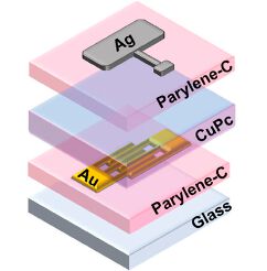 In this way, a logic gate that regulates the flow of current can be printed for each transistor. This gate is made from chitosan, a natural polymer derived from the shells of crustaceans and often used in the food industry as a gelling agent. By applying a low voltage (less than 1 V) to the gate, the current flow through the transistor can be controlled, thus turning it on or off. Poly(chloro-p-xylene)-C, also known as Parylene C, serves as the coating material and a dielectric interlayer. It has a good barrier effect against stomach acid. This enables the transistor to function smoothly within the body for up to a year before it dissolves.